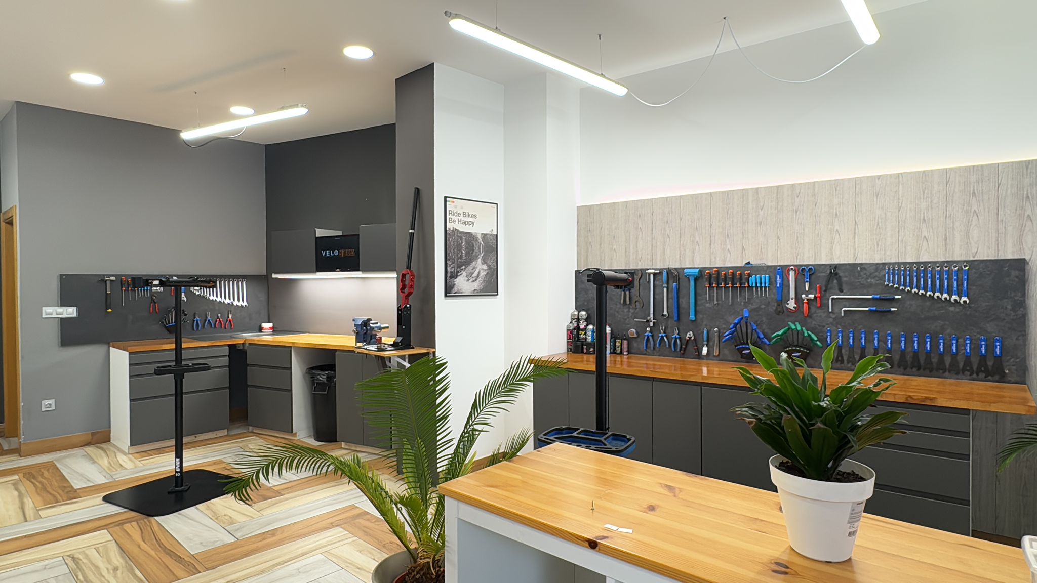 Velobide no es un taller complementario a una tienda: es el taller. Contamos con la maquinaria más precisa del mercado y diferentes zonas de trabajo diseñadas para cubrir cualquier necesidad de tu bici.